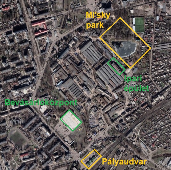 A Google Earth műholdképein a park, amelyben biztonsági kamerák rögzítették az egyik robbanást, az ipari épület, amelyiket az egyik rakéta eltalálta, a bevásárlóközpont, amit a másik rakéta megsemmisített, valamint a vonatállomás. A képernyőmentés 2022. június 6-án készült.