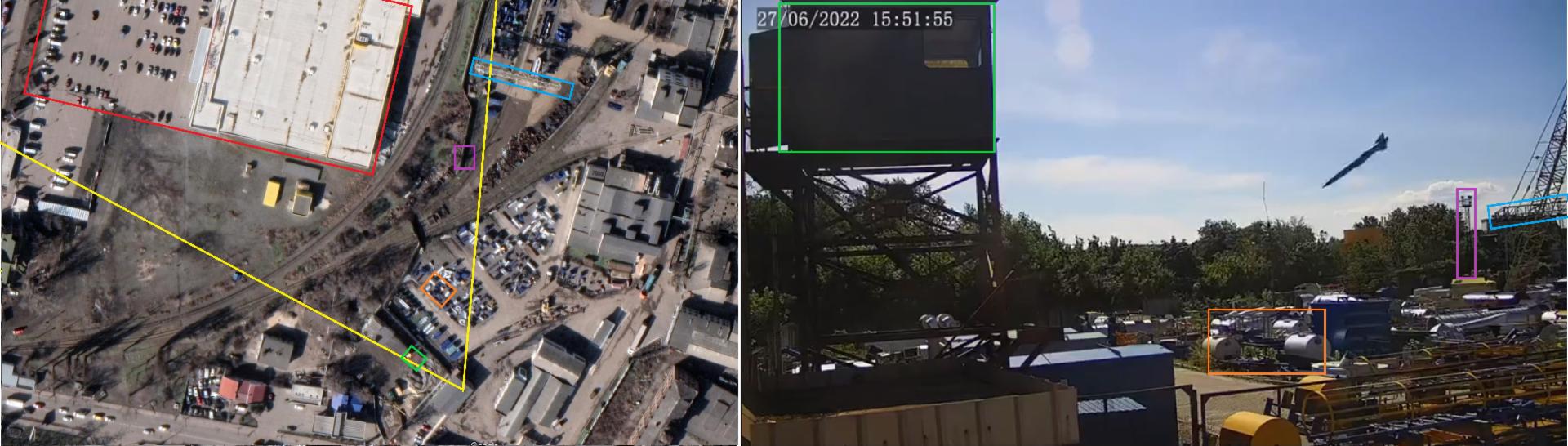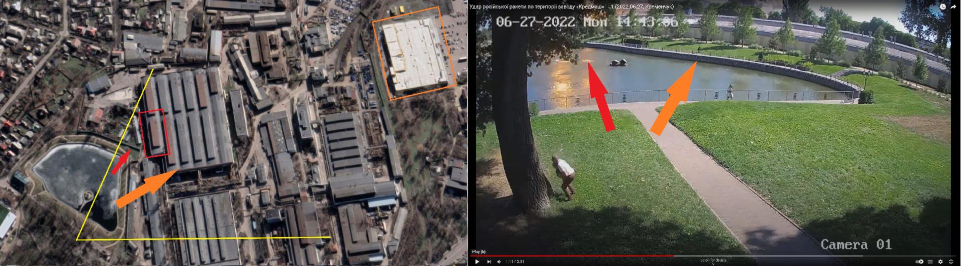 Műholdfelvétel a gyár területéről (balra) és egy képernyőkép a Mis’ky Park biztonsági kamerájának felvételéről (jobbra). Ebben a pillanatban csapódik be a második rakéta a gyár területére (balra fent, az AFP által pirossal jelölve). A kép felső középső részén (fent, az AFP által narancssárgával jelölve) már füstfelhő látható, nagyjából ott, ahol a bevásárlóközpont is található. A Google Mapsből származó képernyőképek: 2022. július 4.