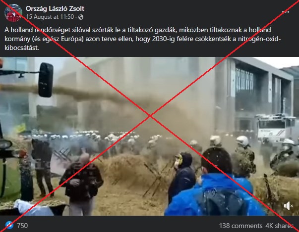 “A holland rendőrséget silóval szórták le a tiltakozó gazdák, miközben tiltakoznak a holland kormány (és egész Európa) azon terve ellen, hogy 2030-ig felére csökkentsék a nitrogén-oxid-kibocsátást” – olvasható az a magyar Facebook-bejegyzés, amit már több mint négyezren osztottak meg 2022. augusztus 15-e óta.