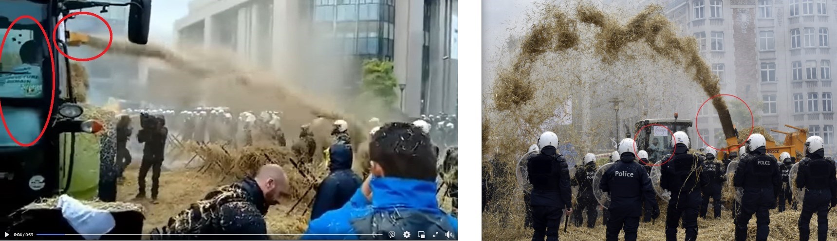 Az AFP fotóján a jobboldalon a teljes gépet látni, a videón csak a szalmatöreket kifújó csőcsonk látható. A fehér pólós férfi a vezetőfülkében szintén látható mindkét képen. Az AFP fotója a következő leírással szerepel a képadatbázisban: “Gazdák szalmát szórnak a rendőrökre egy kombájnból egy tüntetés alatt az Európai Bizottság épülete előtt 2015. szeptember 7-én, Brüsszelben.”
