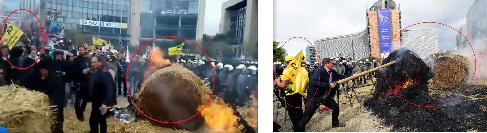 A pirossal bekarikázott zászló szintén felbukkan a videóban és az AFP fotóján is, ahogyan az égő szalmabálát is látni mindkét felvételen. Az AFP fotójának a leírása a következő: “Európai gazdák szalmabálákat gyújtanak fel, miközben tiltakozásul lezárják az uniós intézményekhez vezető utat Brüsszelben, 2015. szeptember 7-én.”