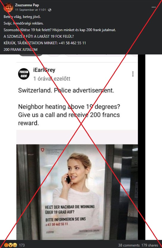 Számos Európai országnak – köztük Svájcnak is – egy lehetséges energiaválsággal kell szembenéznie az Ukrajna elleni orosz támadás árnyékában. De az nem igaz, hogy Svájcban arra kérnék a lakosságot, hogy jelentsék a szomszédaikat, ha 19 fok fölé fűtik a lakásukat, mint ahogyan azt a szeptember közepe óta a Facebookon terjedő magyar bejegyzések állítják. A bejegyzésekben egy képet látni egy nyilvános helyen kirakott plakátról. A plakáton egy telefonáló nő képe van, alatta pedig a következő felirat olvasható németül: “A szomszéd 19 fok fölé fűti a lakást? Kérjük, értesítsen minket! A bejelentés névtelen. 200 frank jutalom”. A hamisított plakáton a svájci kormány címere is megtalálható. Ugyanez a hamis állítás már franciául, románul, spanyolul, bolgárul és görögül is terjedni kezdett.