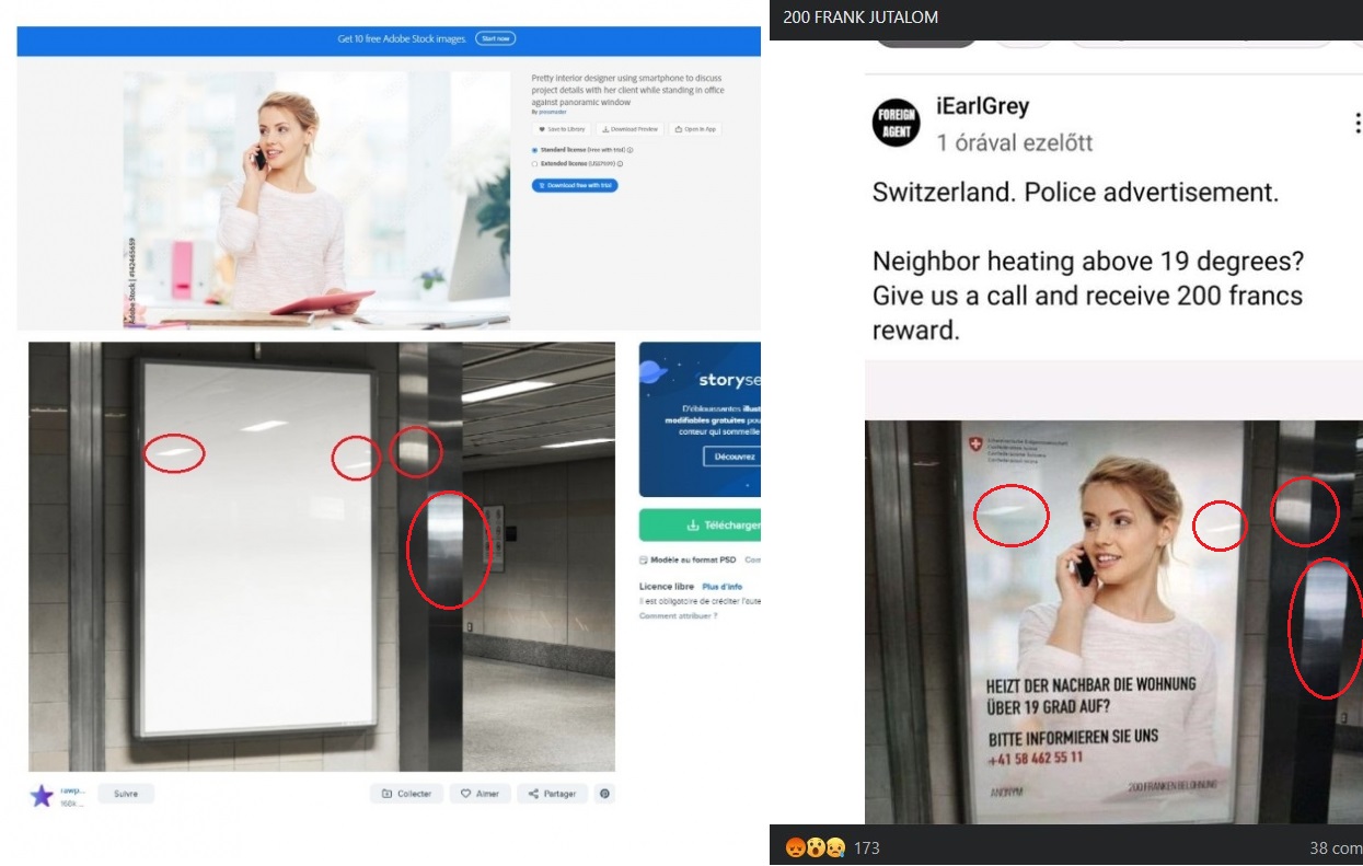 Több százan osztottak már meg magyarul a Facebookon egy hamis plakátot, ami azt állítja, hogy Svájcban 200 svájci frank jutalom jár azoknak, akik feljelentik a szomszédukat, ha az 19 fok fölé fűti a lakását. A hamisított kép számos nyelven terjedni kezdett, miközben egész Európában aggodalmat kelt az Ukrajna elleni orosz inváziót követő energiaválság. A svájci kormány az AFP kérdésére megerősítette, hogy “semmi köze” a képhez, és az “manipuláció”. A poszterről készült kép a valóságban utólag lett több képből összevágva.