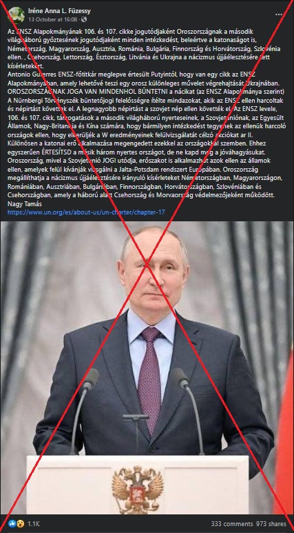 Az ENSZ alapító okiratáról szóló hamis állítások 2022 októberében kezdtek el terjedni magyarul. A Facebookon terjedő szöveget több száz felhasználó osztotta meg, azt állítva, hogy az Alapokmány alapján “OROSZORSZÁGNAK JOGA VAN MINDENHOL BÜNTETNI a nácikat”. Ugyanez a hamis állítás több más nyelven is terjedni kezdett, többek között szlovákul, csehül és franciául is.