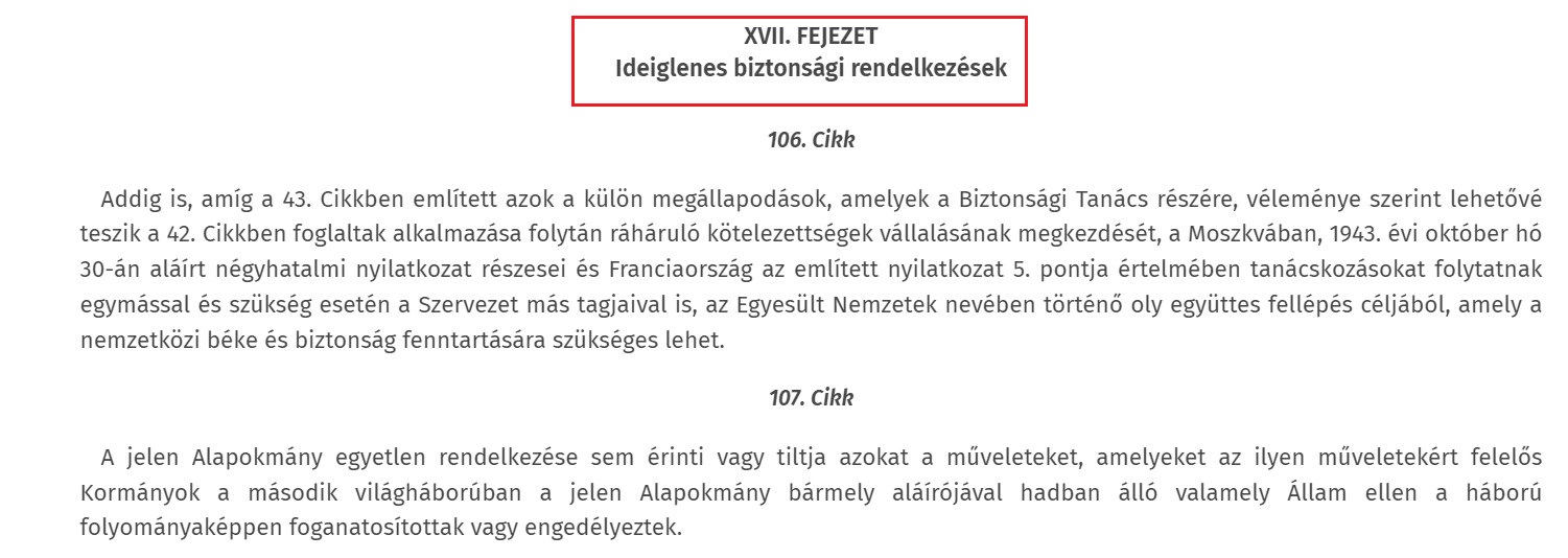 Az Egyesült Nemzetek Szervezetének alapító okirata, amely az ENSZ Biztonsági Tanácsának előfutára volt, néhány hónappal azelőtt írodott, hogy 1945 szeptemberében végleg befejeződött a második világháború. Az ENSZ Alapokmánya olyan átmeneti záradékokat tartalmaz, amelyek csak ebben a történelmi összefüggésben érvényesek és egyértelműen “ideiglenes” megjelöléssel vannak ellátva. A közösségi médiában azonban azzal a hamis állítással kezdett terjedni az Alapokmány szövege, amely szerint a dokumentum felhatalmazta Oroszországot arra, hogy 2022 februárjában lerohanja Ukrajnát. Több jogi és politikai szakértő is azt mondta az AFP kérdésére, hogy a záradékok elavultak, és nem lehet rájuk hivatkozni a jelenlegi konfliktusban.