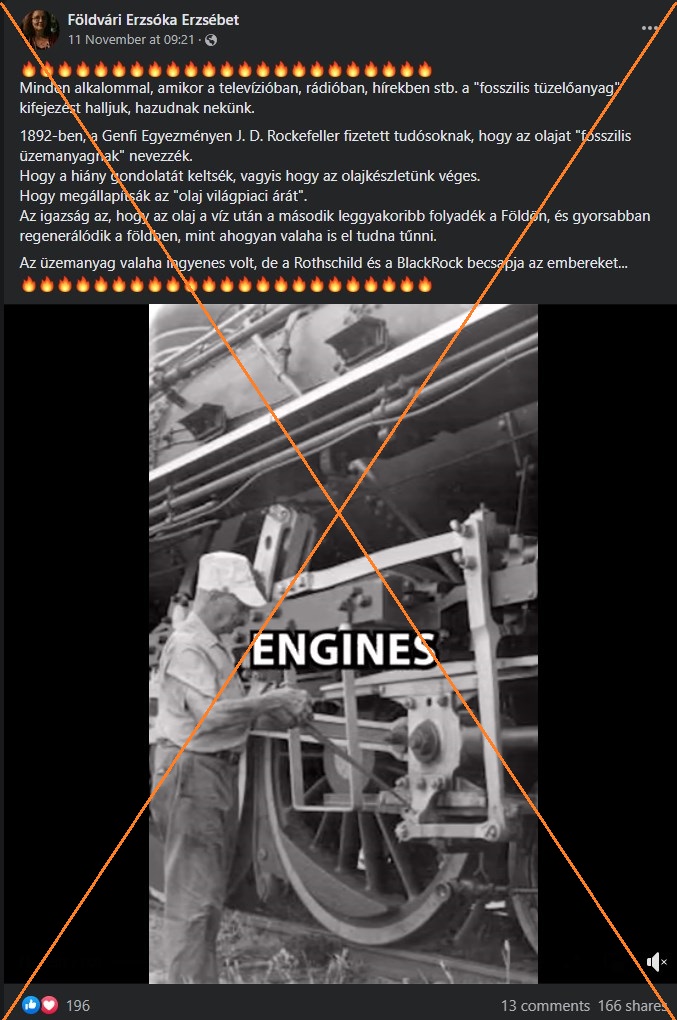 Több mint száz felhasználó osztott meg egy magyar Facebook-bejegyzést 2022. november 11-e óta, amelyben különböző félrevezető állításokat olvasni a kőolajról. Az azóta törölt poszt azt állítja, hogy a kőolaj “gyorsabban regenerálódik a földben”, mint ahogyan kitermelhető lenne, valamint hogy csak mesterségesen terjesztették el, hogy korlátozott mennyiségben áll rendelkezésre olaj, hogy így verjék fel az árakat. A szöveg – amelyet egy hasonló állításokat angolul felsoroló videó kísér – azt is állítja, hogy a “fosszilis tüzelőanyag” kifejezés “hazugság”, amelyet a 19. században vezettek be John D. Rockefeller amerikai olajmágnás kérésére.