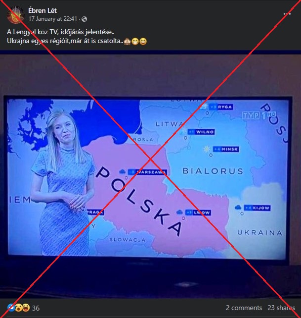 “A Lengyel köz TV, időjárás jelentése..Ukrajna egyes régióit, már át is csatolta..” – írja az a magyar Facebook-bejegyzés, amelyet 2023. január 17-i publikálása óta már több tucatnyian osztottak meg. A hamis kép már több más nyelven is terjedni kezdett, többek között angolul, németül, franciául, szlovákul és csehül.