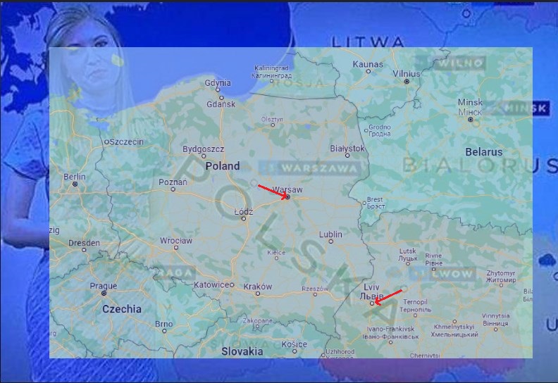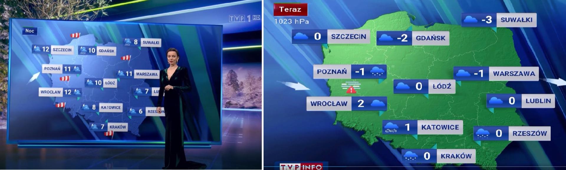 A TVP1 lengyel közszolgálati televíziós csatorna nem sugárzott egy olyan időjárás-előrejelzést, amely ukrán területeket Lengyelország részeként ábrázol, ellentétben azzal, amit egy 2023 januárjában több európai nyelven, köztük magyarul is terjedő hamis kép sugall. A hamisított kép helyesírási hibákat tartalmaz, és teljesen más dizájnt használ, mint a TVP1 valódi előrejelzései. A manipulált fotóhoz, úgy tűnik, hogy egy másik lengyel televíziós csatorna 2020-as időjárás-jelentéséből vették a bemondó képét. A TVP közleményt adott ki, amelyben hamisítványnak nevezték a közösségi médiában terjedő képet.