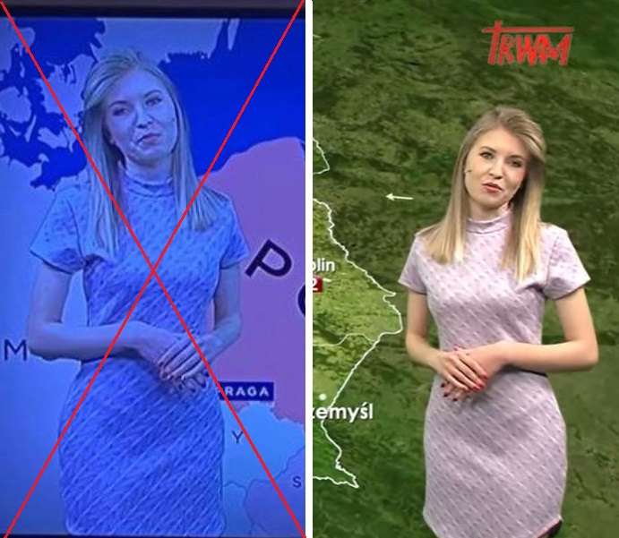 A nő a 2020-as videóban ugyanolyan ruhát visel, valamint a körömlakkja és a sminkje is ugyanolyan, mint a hamis képen. A háttér viszont más: a videón a Trwam televíziós csatorna időjárás-előrejelzése látható a felvételen.