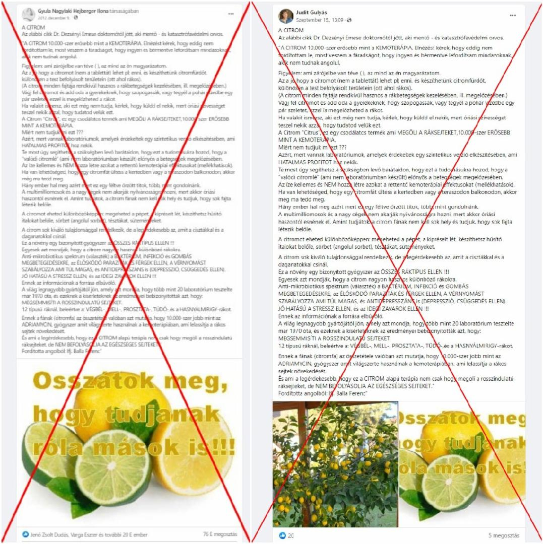 “A citrom tízezerszer erősebb, mint a kemoterápia” – olvasható egy 2023. szeptember 15-én megosztott magyar Facebook-bejegyzésben. A poszt azt állítja, hogy a citrom bizonyítottan gyógyír “az összes ráktípus ellen”, valamint hogy “megöli a rosszindulatú rákos sejteket 12 típusú ráknál”. A bejegyzés a citrom egyéb állítólagos egészségügyi előnyeiről is beszél, például azt állítja, hogy hatásos a paraziták és férgek ellen. A szöveg arra buzdítja az olvasókat, hogy egyék meg a gyümölcsöt, vagy igyák meg a levét.