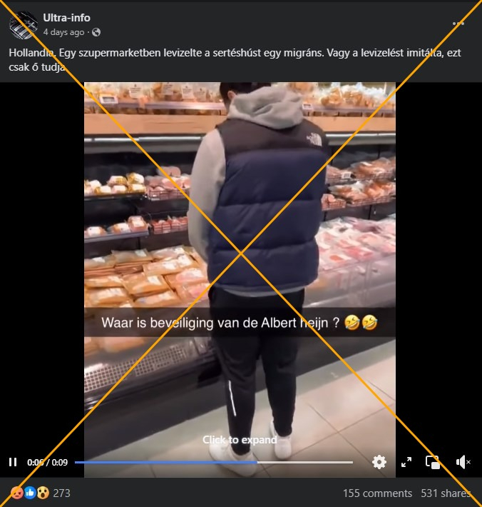 A közösségi médiában 2023 decemberében hollandul, valamint magyarul és németül is terjedni kezdett egy videó, amin állítólag azt látni, ahogyan “egy fiatal férfi disznóhúsra vizel” egy holland szupermarketben. A videón hollandul azt hallani, hogy az elkövető azért teszi ezt, “mert nem eszik disznóhúst”. A felvétel hamar virális lett, és több nyelven is dühös hozzászólásokhoz vezetett, amelyekben a felhasználók a muszlim közösséget támadták. A videó készítője azonban az AFP-nek elmondta, hogy az egész csak egy tréfa volt, és a valóságban a felvételen szereplő férfi nem vizelt rá a hústermékekre. A szerző azt is elmondta, hogy már egy sor hasonló videót is készített eltérő helyszíneken. A szupermarket tulajdonosa, egy kiskereskedelmi lánc azt nyilatkozta, hogy nem érkezett panasz ilyen incidensről egyik üzletükből sem.