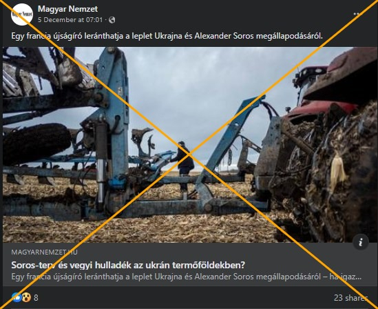 „Soros-terv és vegyi hulladék az ukrán termőföldekben?” – ezzel a címmel publikált egy szöveget a Magyar Nemzet kormánypárti lap online kiadása 2023. december 5-én. Az írás szerint egy francia újságíró olyan dokumentumokat publikált, amelyekből állítólag kiderül, hogy Alexander Soros (Soros György fia) legutóbbi ukrajnai látogatása során egy olyan üzletet hozott tető alá egyes cégek és az ukrán állam között, amely lehetővé teszi veszélyes hulladék lerakását ukrán termőterületeken.