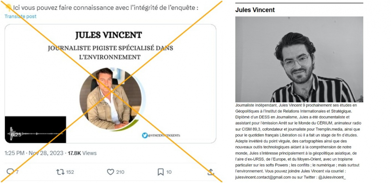 Az AFP-nek sikerült kapcsolatba lépnie ezzel a Jules Vincent-nel, a Liberationban megjelent cikkek szerzőjével, aki 2023 december 6-án telefonon elmondta, hogy a kérdéses cikkeket a Liberationnál 2019-ben, a két hónapos szakmai gyakorlata alatt írta. Vincent azt is elmondta, hogy nincs köze a jelenleg az interneten terjedő Ukrajnáról szóló állítólagos “nyomozáshoz”.