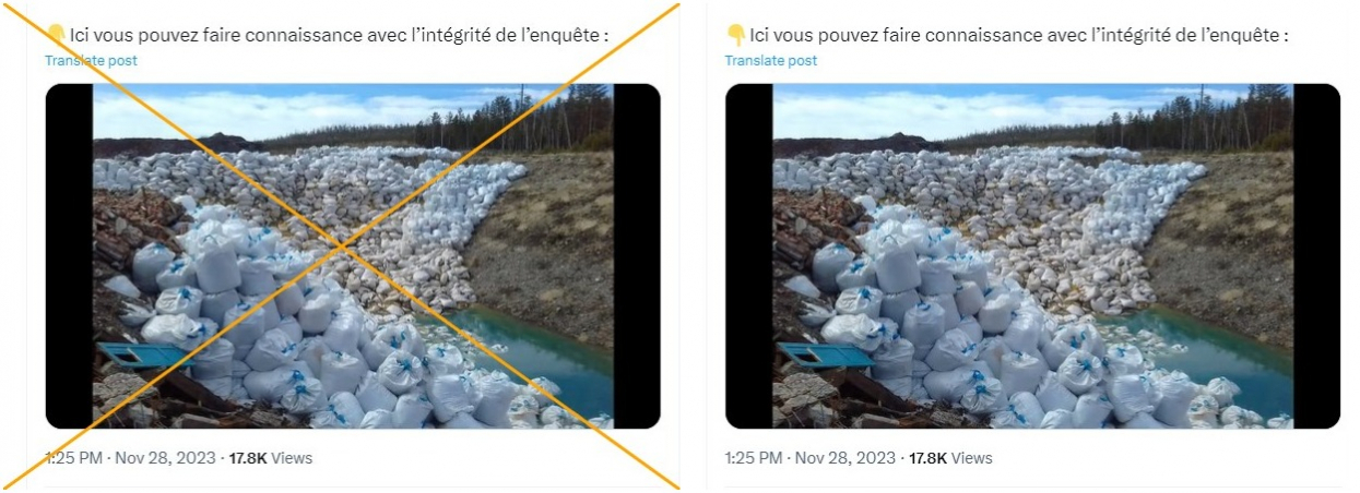 Az X-en közzétett videóban 6:07-nél egy olyan fotót látunk, amelyen több száz zsák van szétszórva a földön, miközben az önmagát “Jules Vincent”-ként bemutató személy “vegyi hulladékok temetkezési helyéről” beszél, ami azt a benyomást keltheti a nézőben, hogy a kép Ukrajnában készült.
