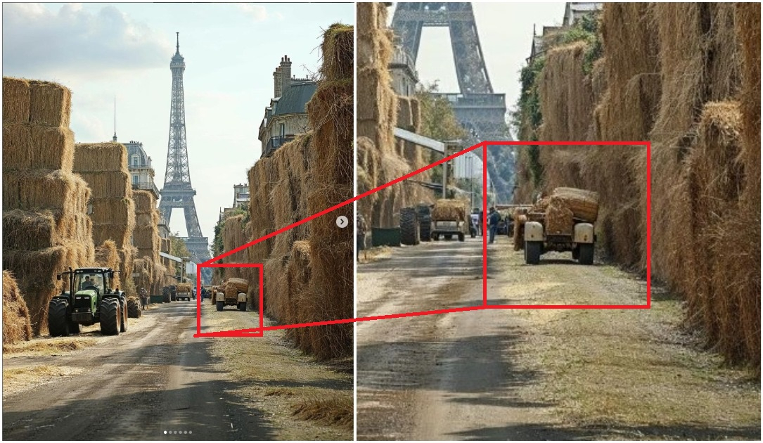 Január végén és február elején hatalmas demonstrációkat tartottak a gazdák Franciaországban. Országszerte traktorok hosszú sora állta el az utakat, például a Párizsba vezető autópályákat is. Erre a közösségi média felhasználók több országban is úgy reagáltak, hogy egy mesterséges intelligenciával (MI-vel) létrehozott képet kezdtek terjeszteni. A képen traktorok, valamint szalmabálákból állított hatalmas falak láthatók Párizs belvárosában, háttérben az Eiffel-toronnyal. A kép mellé pedig olyan magyarázatot írtak, ami alapján azt lehet feltételezni, hogy a fotó valódi. De nem az: a kép mesterséges intelligenciával készült, ezt az alkotó maga is megerősítette az AFP-nek. Emellett az AFP információi alapján az is biztosan állítható, hogy a gazdatüntetések nem értek el Párizs központjáig.