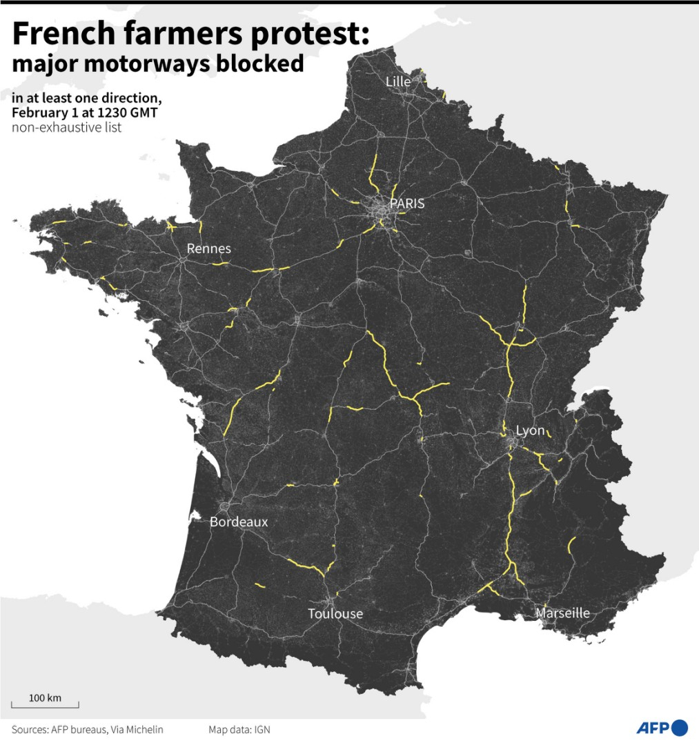 Nagyobb útlezárások Franciaországban a 2024. február 1-i tüntetések alatt AFP