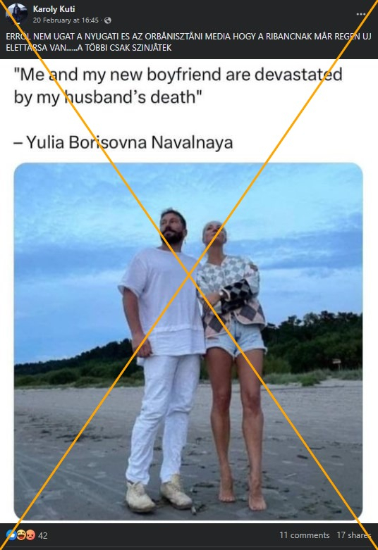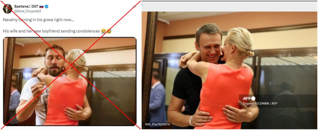 2024. február 16-án az orosz hatóságok bejelentették Alekszej Navalnij Kreml-kritikus aktivista és politikus halálát. Sok nyugati vezető az orosz kormányt hibáztatja a halálesetért. Eközben Navalnij özvegyéről, Julija Navalnajáról egy olyan fotó kezdett el terjedni a közösségi médiában, amin egy férfival látni egy tengerparton. A felhasználók azt állítják, hogy a kép nemrég készült, és Navalnaja új barátját látni rajta. A posztok azt sugallják, hogy a nyilvános szerepléseken Navalnij özvegye csak megjátszotta, hogy gyászol. A fotó azonban 2021-ben készült és ez állítás ráadásul csak egy a Julia Navalnaját célzó támadások közül.