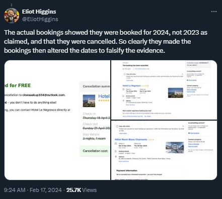 Eliot Higgins, a Bellingcat nevű oknyomozó médium alapítója szerint azonban a képen egy 2024 áprilisára szóló, törölt foglalásról van szó. “Egyértelmű, hogy lefoglalták, majd megváltoztatták a dátumokat, hogy meghamisítsák a bizonyítékokat”, és úgy tűnjön, mintha 2023-ról lenne szó – magyarázta Higgins.
