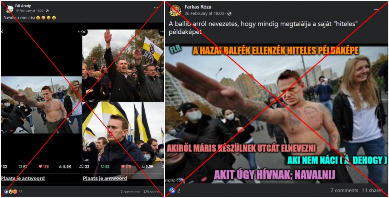 Az interneten reakciók egész sora jelent meg, miután Alekszej Navalnij orosz ellenzéki aktivista és politikus 2024. február 16-án meghalt egy orosz börtönben. Míg sok felhasználó tiszteletét fejezte ki, mások ünnepelték Navalnij halálát, és azt állították, hogy a Kreml vezető ellenfele “neonáci” volt. Az állításaik alátámasztására egy olyan manipulált képet kezdtek terjeszteni, amin Navalnijt Hitler-tetoválással látni, amint éppen náci karlendítésre emeli a karját. A kép manipulált, egy politikai felvonuláson készült egy másik férfiról, aki nem Navalnij. Az aktivista arcát utólag vágták a képre. Az igaz, hogy Navalnijnak voltak korábban nyilvánosan xenofób megjegyzései, de a képen nem őt látni.