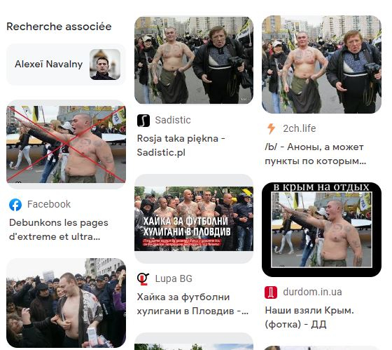 A Google képkeresőjében a kapcsolódó találatok között egy hasonló fotót is találni egy kopasz férfiról, akinek azonos mellkasi tetoválásai vannak, mint a szerkesztett képen. De ez a férfi nem Navalnij.