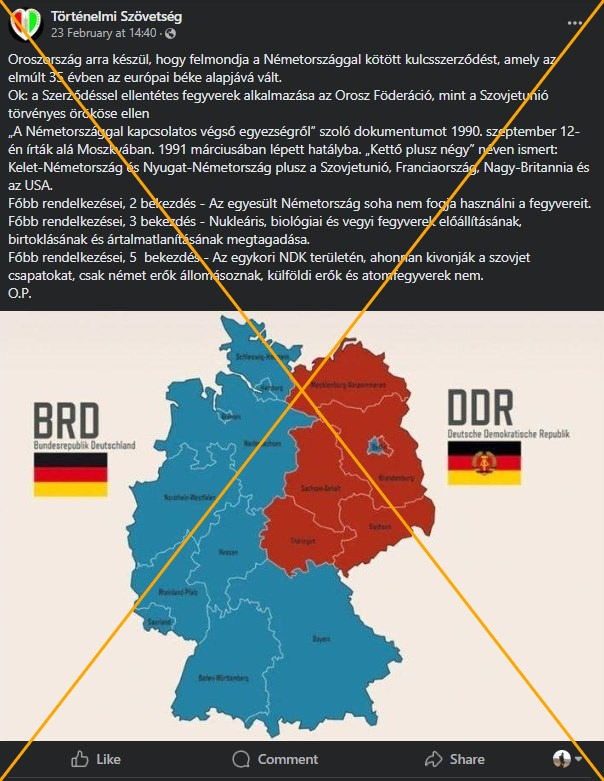 “Oroszország arra készül, hogy felbontja az NSZK-val kötött szerződést, amely az elmúlt 35 évben a béke záloga volt a régióban. Az ok: a szerződés rendelkezéseit megsértve német fegyvereket használnak Oroszország (mint a Szovjetunió jogutódja) ellen” – olvasható a Facebookon az 1990-ben, Moszkvában aláírt “Kettő plusz Négy” szerződésről szóló posztokban. Alina Lipp, oroszbarát influenszer pedig a Telegramon osztotta meg a fenti állításokat a több mint 180 ezer követőjével.