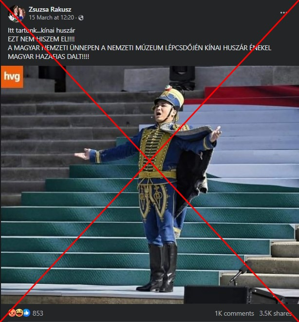 “Itt tartunk…kínai huszár. EZT NEM HISZEM EL!!!! A MAGYAR NEMZETI ÜNNEPEN A NEMZETI MÚZEUM LÉPCSDŐJÉN KÍNAI HUSZÁR ÉNEKEL MAGYAR HAZAFIAS DALT!!!!” – olvasható egy magyar Facebook-bejegyzésben, amit a 2024. március 15-i megjelenése óta már több mint 3500 alkalommal osztottak meg. A posztban található képen egy huszárruhát viselő férfi énekel a Nemzeti Múzeum lépcsőjén, ott ahol 2024. március 15-én Orbán Viktor miniszterelnök beszédet tartott a nemzeti ünnep alkalmából.