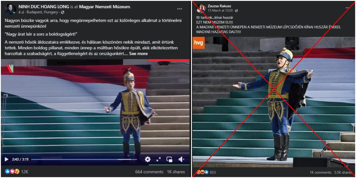 Ninh Duc Hoang Long vietnami születésű magyar operaénekes volt az egyik énekes a március 15-i állami ünnepségen 2024-ben. A közösségi médiában terjedni kezdett egy kép egy huszárjelmezes férfiról az ünnepségen, azzal a hamis állítással, hogy a fotón egy “kínai huszár” látható. Ninh Long azonban megerősítette az AFP-nek, hogy ő látható a képen, valamint hogy 2018 óta magyar állampolgár. Ninh Long Vietnamban született, 2013 óta él Magyarországon. A képpel kapcsolatos hamis állítások a magyar kormány Kína-politikáját bíráló kommentek kíséretében kezdtek el terjedni a közösségi médiában.