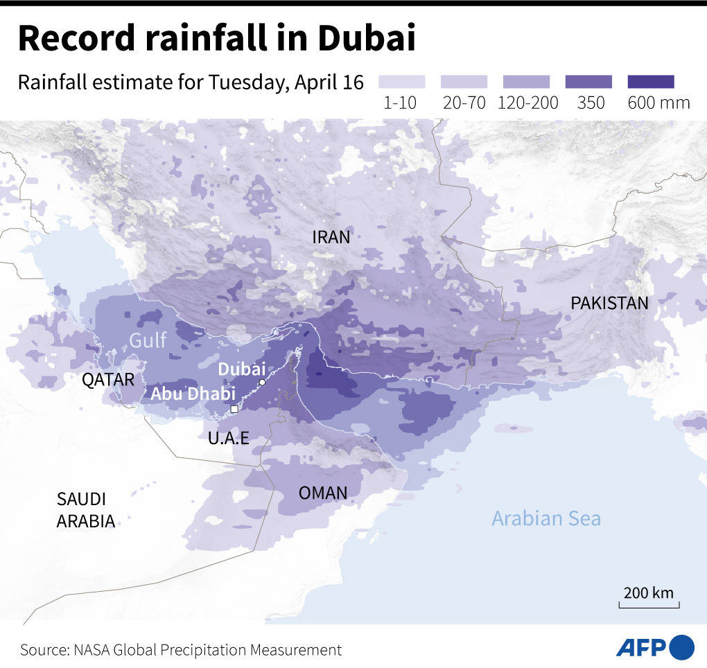 2024. április 16-án az országban eddig feljegyzett leghevesebb esőzések utakat, házakat és bevásárlóközpontokat árasztottak el az Egyesült Arab Emírségekben. Az iskolákat országszerte bezárták. A világ egyik legforgalmasabb légikikötője, a Dubaji Nemzetközi Repülőtér rövid időre leállította működését, és még több napig jelentős fennakadások voltak – ahogyan arról az AFP is beszámolt.