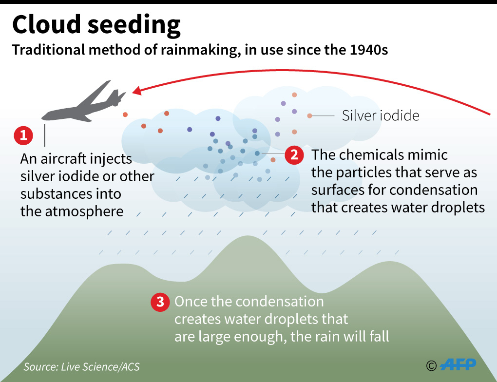 Egy korábbi tényellenőrzésben az AFP elmagyarázta, hogy a felhőetetés során vegyületeket juttatnak a meglévő felhőkbe, amik szuperhideg vízcseppeket képeznek, és növelik az eső vagy hó kialakulásának esélyét (archivált link). Az általában repülőgépek segítségével végrehajtott művelet fizikai reakciót idéz elő, nem pedig kémiait.