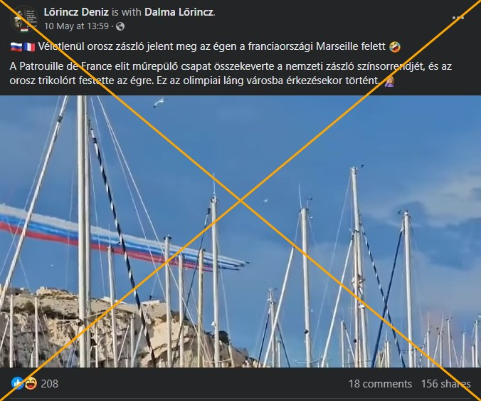 “Véletlenül orosz zászló jelent meg az égen a franciaországi Marseille felett. A Patrouille de France elit műrepülő csapat összekeverte a nemzeti zászló színsorrendjét, és az orosz trikolórt festette az égre. Ez az olimpiai láng városba érkezésekor történt” – olvasható egy magyar Facebook bejegyzésben. A videó a 2024. május 10-i megosztása óta már több mint 17 ezer megtekintést és 156 megosztást ért el.