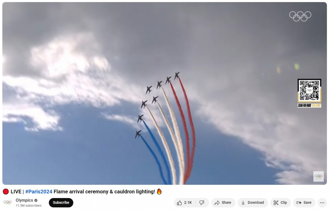 A videón nyolc repülőgép látható, amelyek kék, fehér és piros színű füstöt bocsátanak ki. A kommentátor így kommentálta az eseményt: “Az olimpiai karikák után most a francia trikolór színei jönnek”.