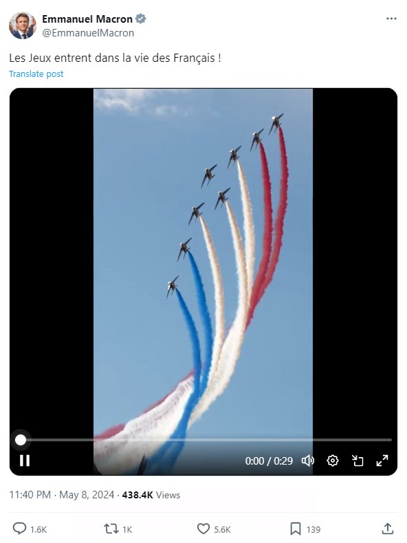 Emmanuel Macron francia elnök is közzétett egy videót a bemutatóról a hivatalos X-fiókján 2024. május 8-án (itt archiválva). “Az [olimpiai] játékok belépnek a franciák életébe!” – írta Macron.