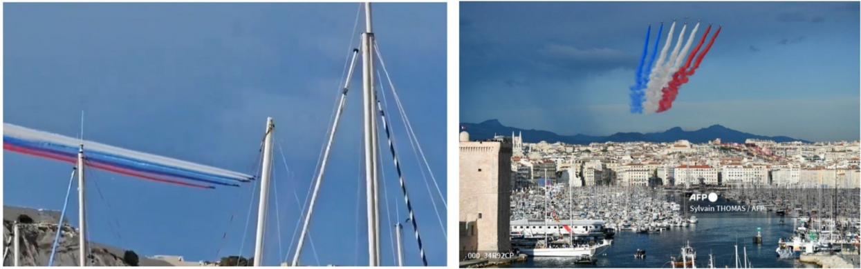 2024 nyarán Franciaország ad otthont az olimpiai játékoknak. Marseille-ben ezért légi bemutatóval köszöntötték az olimpiai lángot. Az interneten az a téves állítás kezdett el terjedni, hogy a bemutatón a repülőgépek a francia zászló helyett az orosz zászlót rajzolták az égre. Az interneten keringő videót azonban olyan szögből rögzítették, amelyben a trikolór színei rossz sorrendben jelennek meg. Az eseményről készült élő felvétel és a fotók azonban világosan azt mutatják, hogy a sugárhajtású repülőgépek a francia trikolórt festették az égre.