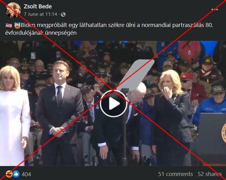 A kritikusai szerint egy videón az látható, hogy Joe Biden amerikai elnök úgy próbál meg leülni, hogy nincs mögötte szék a normandiai partraszállás évfordulójának ünnepségén. De az interneten elterjedt rövid videó eredetileg tartalmazott olyan képsorokat is, amelyeken látszik, hogy az elnöknek volt széke.
