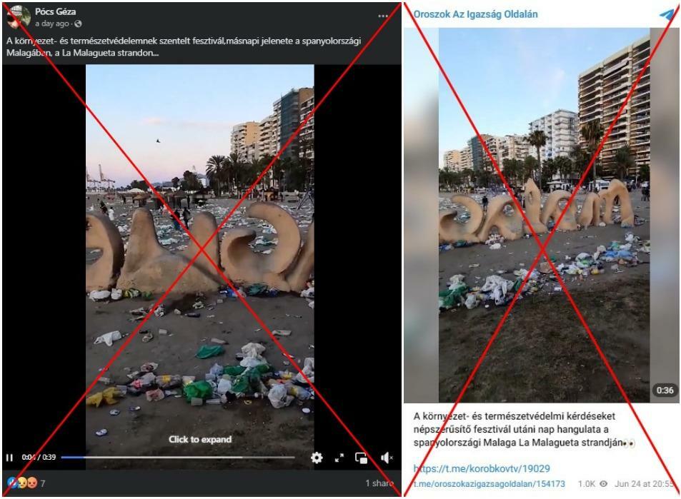 “A környezet- és természetvédelemnek szentelt fesztivál másnapi jelenete a spanyolországi Malagában, a La Malagueta strandon… ” – olvasható egy 2024. június 26-án megosztott magyar Facebook-videó leírásában. A videón egy homokos tengerpart látható, melyetmindenféle szemét borít, köztük üres műanyag zacskók és műanyag palackok.