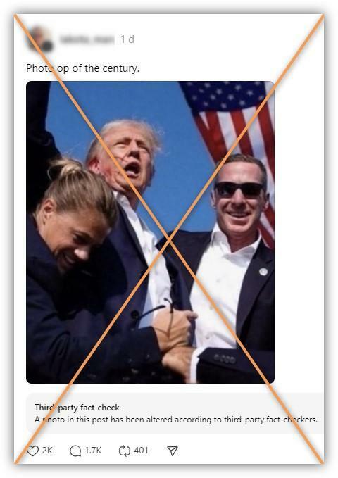Egy digitálisan módosított képen azt látni, ahogyan Trump biztonsági emberei vigyorognak, miközben sietve lekísérik a volt elnököt a színpadról. Ám fordított képkereséssel megtalálható az eredeti fotó (archivált link), amelyen az őrök nem mosolyognak.