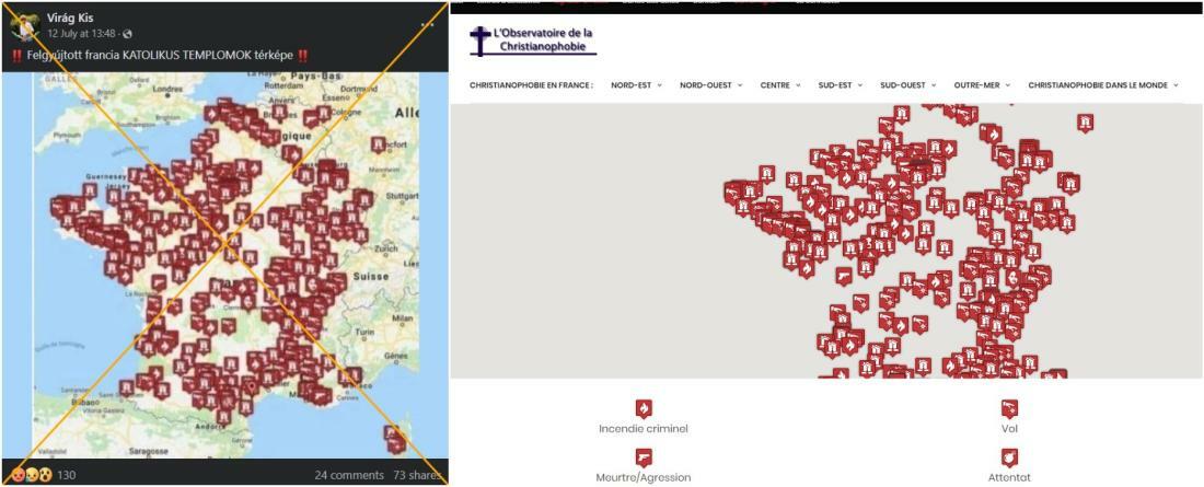 A közelmúltban terjedni kezdett egy 2019-es térkép magyarul, amin egy nem hivatalos gyűjtést lehetett látni a Franciaországban elkövetett “keresztényellenes” cselekményekről, azzal a hamis állítással, hogy a térkép az országban “felgyújtott templomokat” mutatja. A nem hivatalos térkép, amelyet a Kereszténygyűlölet Megfigyelőközpont nevű katolikus blog készített, a tűzesetek mellett a “lopás” és a “vandalizmus” eseteit is tartalmazza. A francia Vallási Örökség Megfigyelőközpont egyesület gyűjtése szerint 2023-ban a véletlen baleset vagy szándékosan gyújtogatás következtében megégett templomok száma 27 volt Franciaország-szerte.