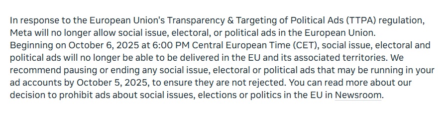 A Meta júliusban jelentette be, hogy októbertől nem engedélyezi tovább a politikai hirdetések futtatását a platformjain, azaz a Facebookon és az Instagramon. A döntést azzal indokolták, hogy nem tudnának megfelelni egy október 10-én életbe lépő új EU-s jogszabálynak a politikai hirdetések átláthatóságáról, ezért – a Google-höz hasonlóan – inkább teljesen lemondanak az ilyen hirdetésekről.
