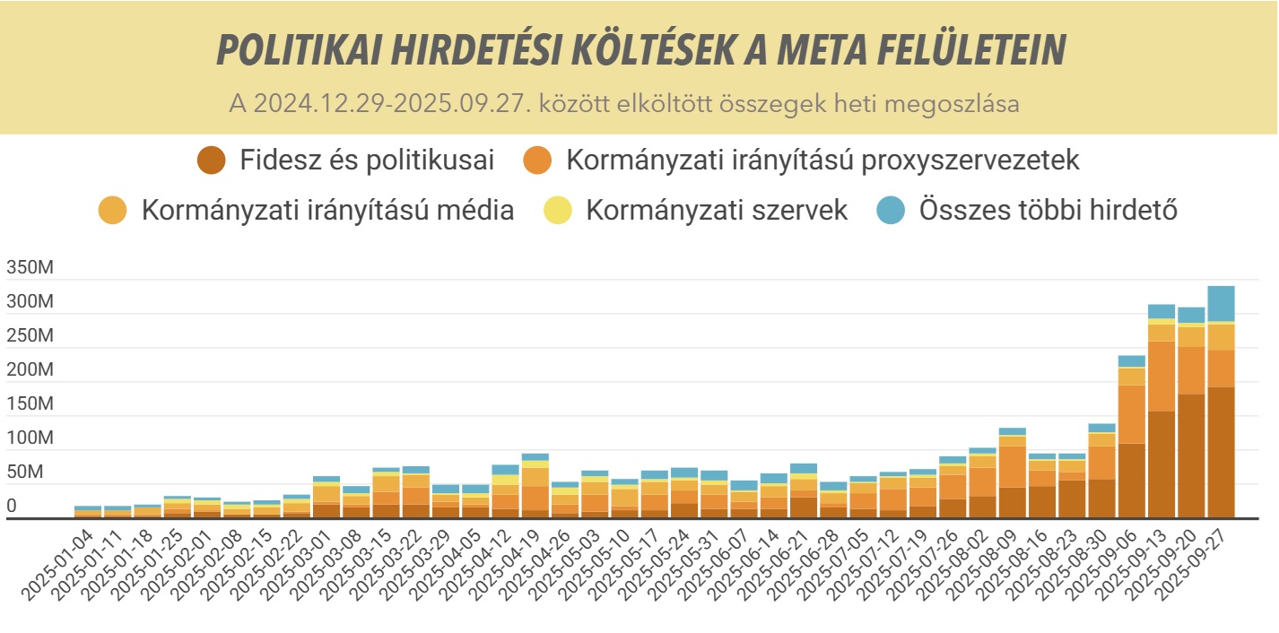 A Political Capital hétről hétre frissülő grafikonján jól látszik, hogy a magyarországi politikai szereplők – élükön a Fidesszel és a kormányhoz köthető szervezetekkel – milyen brutális mértékben emelték meg a politikai hirdetésekre költött összeget a Meta platformjain az október 6-i dátumhoz közeledve.