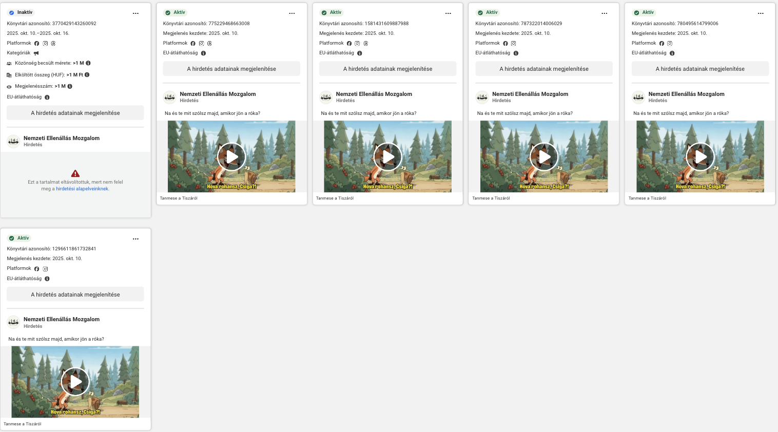 Az, hogy ezeknek a videóknak a terjesztésére pénzt is költöttek, a Meta hirdetéstárából derül ki. De mivel az október 6-i tiltás óta a Meta elvben kizárólag politikamentes hirdetéseket tesz közzé, és az ilyen hirdetéseknél a ráfordított összeget nem tünteti fel, azt nem tudjuk, mennyit fizetett a hirdetésekért a NEM. Csak a hirdetés ténye ismert, és az, hogy hány felhasználót értek el a videókkal.