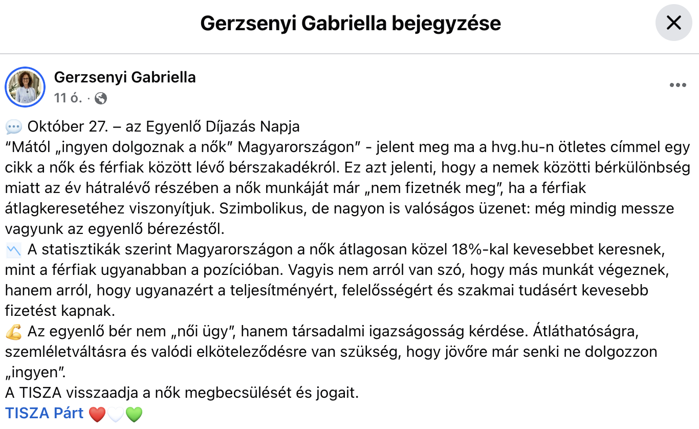 Gerzsenyi Gabriella, a Tisza Párt fővárosi és európai parlamenti képviselője október 27-én a hvg.hu egy cikkére hivatkozva arról posztolt, hogy a férfiak és nők közötti bérkülönbség miatt az év hátralévő részében a nők már „ingyen dolgoznak”.