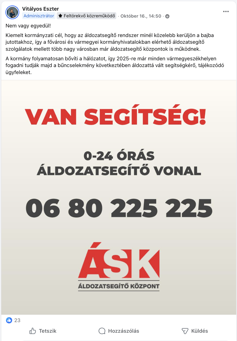 Vitályos Eszter október 16-án külön bejegyzésben osztotta meg az Áldozatsegítő Központ telefonszámát, és a központ előkerült Király Nóra egyik, a DPK-ban megosztott videójában is.