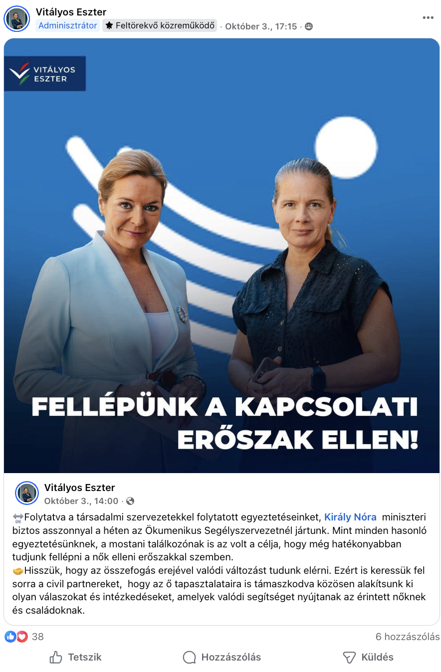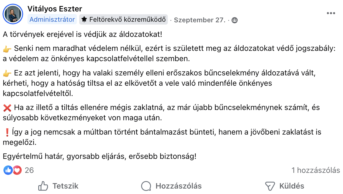 Posztjainak egy része szorosan kapcsolódik a nők elleni erőszak témájához. Fentebb megmutattuk az Áldozatsegítő Központról szóló bejegyzését, de szeptember 27-én például arról írt, hogy a kormány a „törvények erejével is védi az áldozatokat”. Itt az önkényes kapcsolatfelvétellel szemben védelmet nyújtó jogszabályt ismertette.