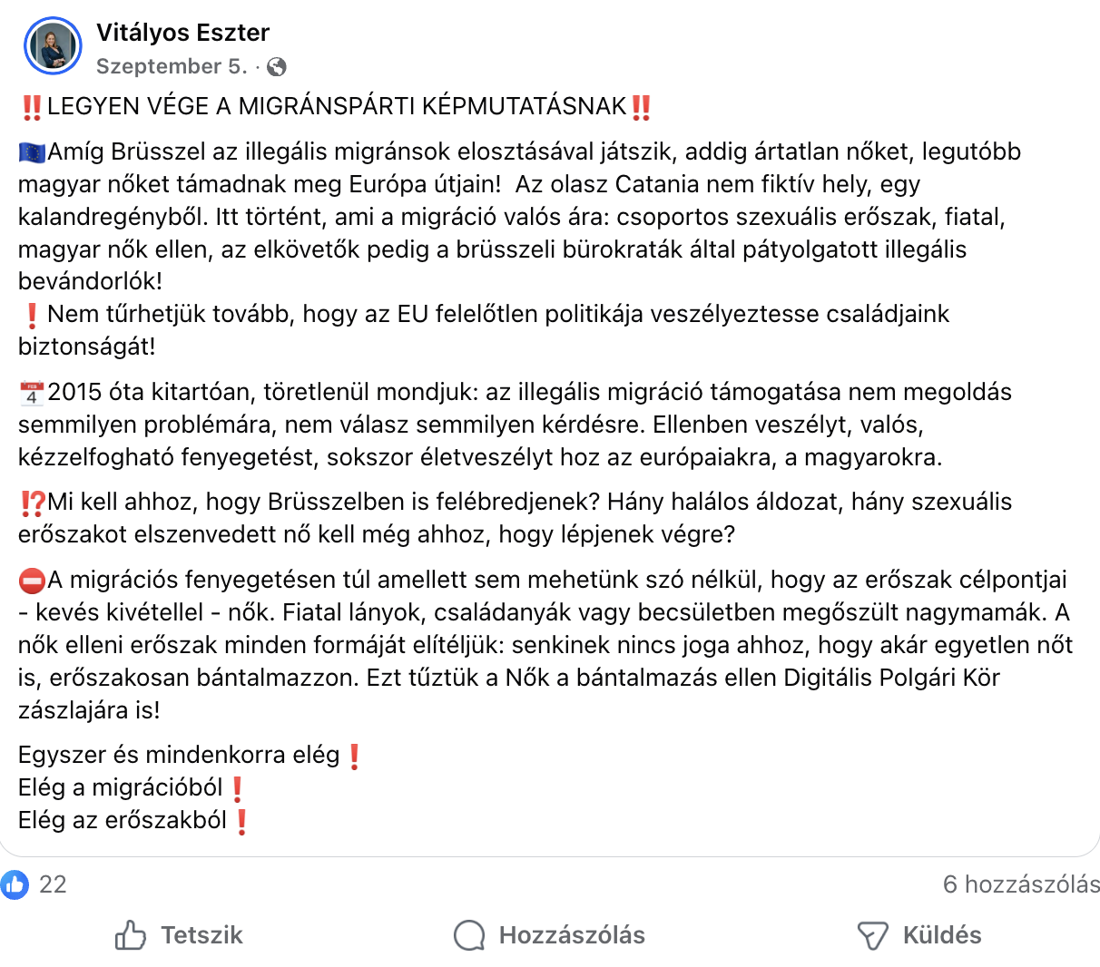 Szeptember 5-én közzétett posztjában Vitályos Eszter a Fidesz migráció- és EU-ellenes kommunikációját követve arról írt a csoportban, hogy az EU felelőtlen politikája veszélyezteti a magyar családok, és így a magyar nők biztonságát is.