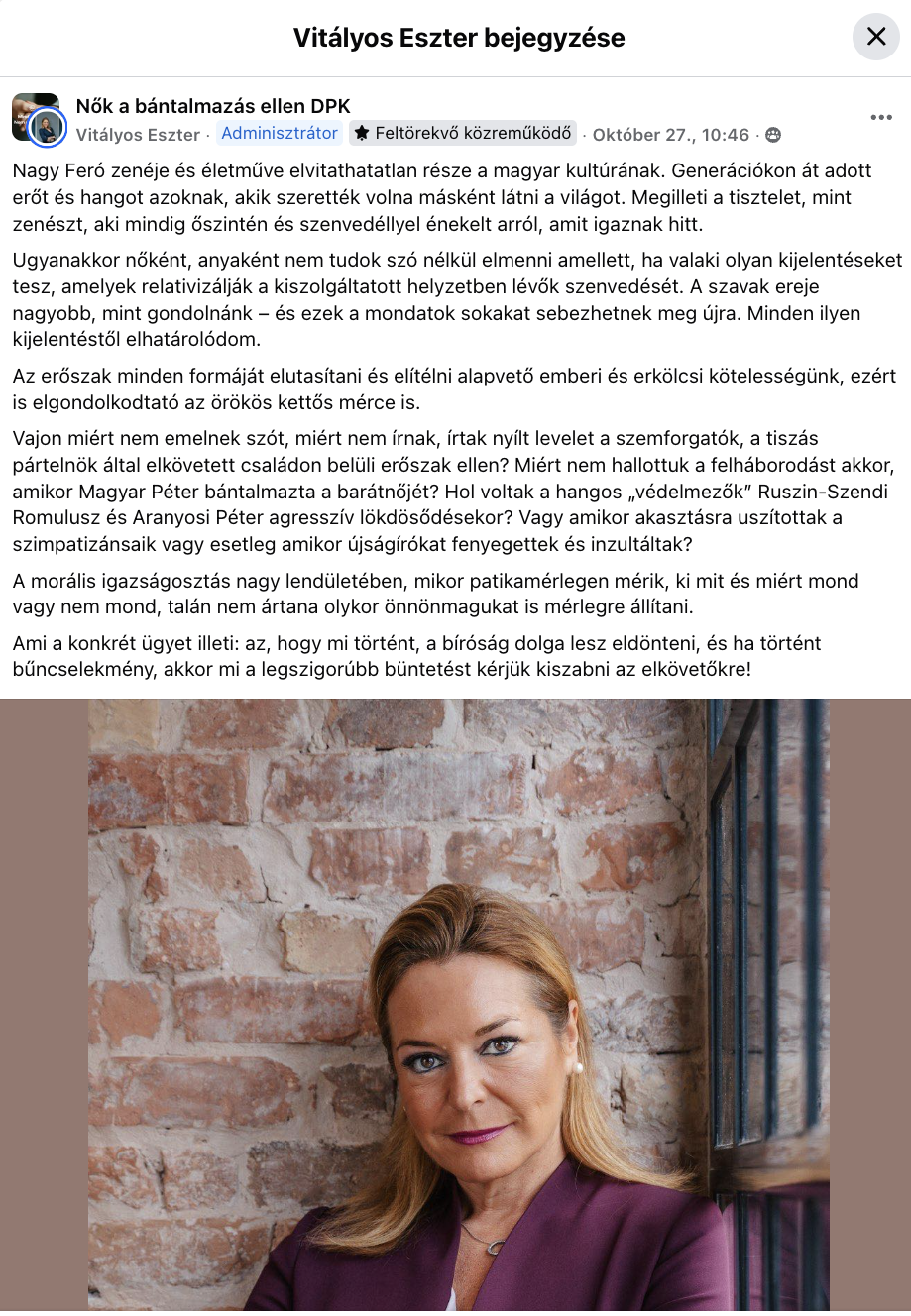 Vitályos ezek után posztolt Nagy Feró megszólalásáról, előbb nyilvános Facebook-profilján, majd ugyanazzal a szöveggel a csoportban is. Bejegyzésében elismerte a zenész életművét, mert szerinte az „elvitathatatlan része a magyar kultúrának”,, ugyanakkor azt is leszögezte, hogy Nagy Feró kijelentései relativizálják a kiszolgáltatott helyzetben lévő nők szenvedését, így ő