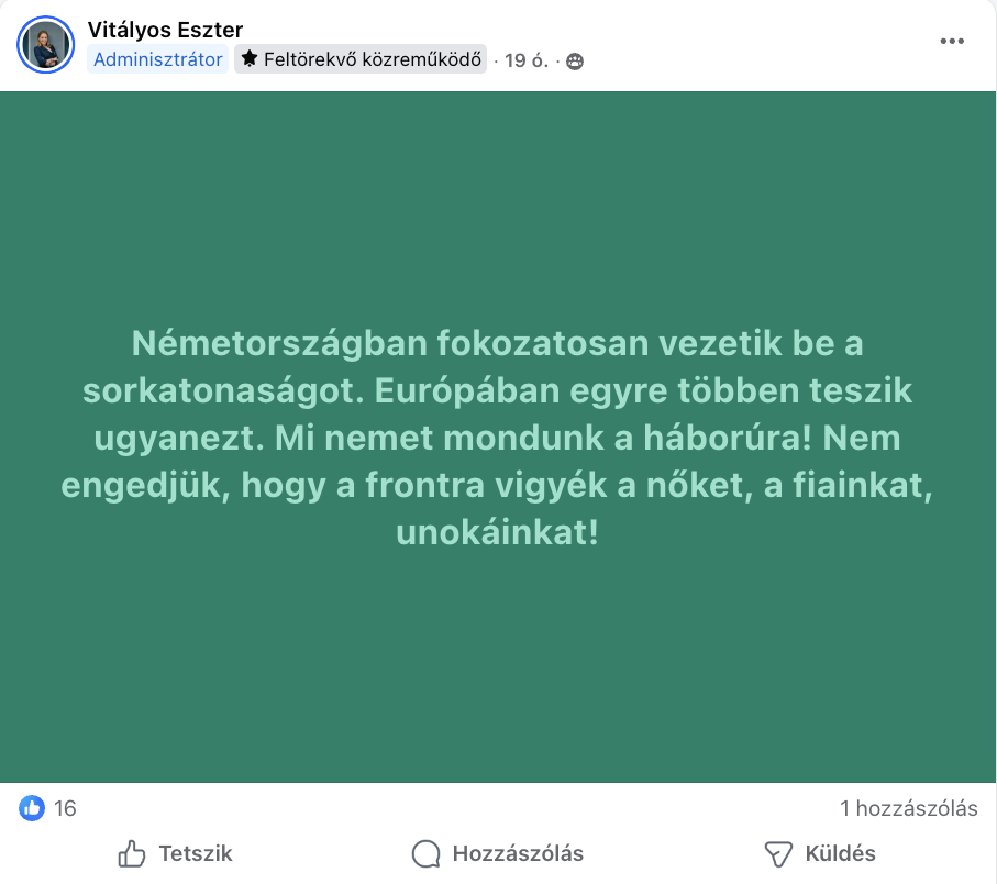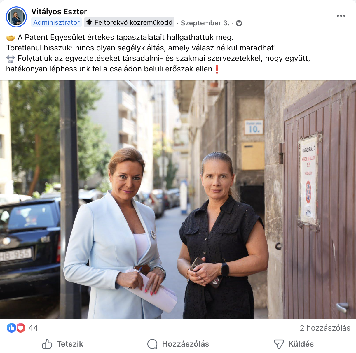 Ez volt az egyetlen alkalom, amikor az Egyesület neve felmerült a csoportban, és Vitályos Eszter azt itt sem említette meg, hogy akinek jogi segítségre van szüksége, az fordulhat a Patenthez.