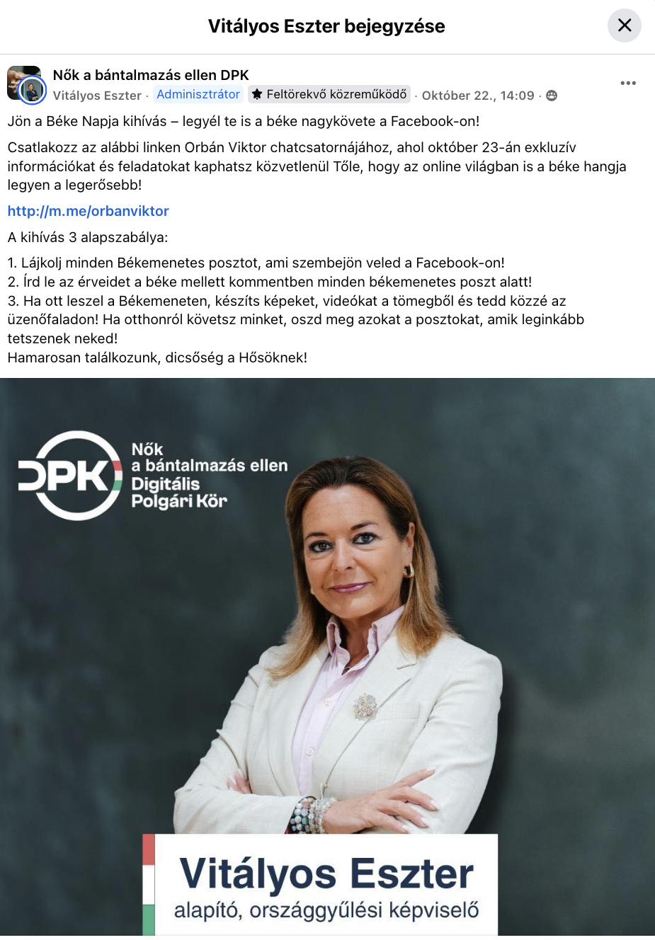 Vitályos Eszter október 22-én közzétett bejegyzésében a „Béke napja kihívás” keretében arra buzdította a tagokat, hogy posztoljanak a Békemenetről, vagy lájkolják az azzal kapcsolatos bejegyzéseket, ezáltal ugyanis a „béke nagykövetévé” válhatnak.