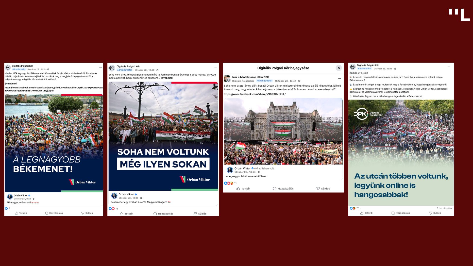 Október 22-én, illetve október 23-án, a Békemenet napján a Digitális Polgári Kör Facebook-oldal is több alkalommal posztolt a bántalmazott nők támogatására létrehozott csoportban. A posztokban arra hívták fel a tagokat, hogy lájkolják vagy osszák meg a miniszterelnök Békementről szóló bejegyzéseit.