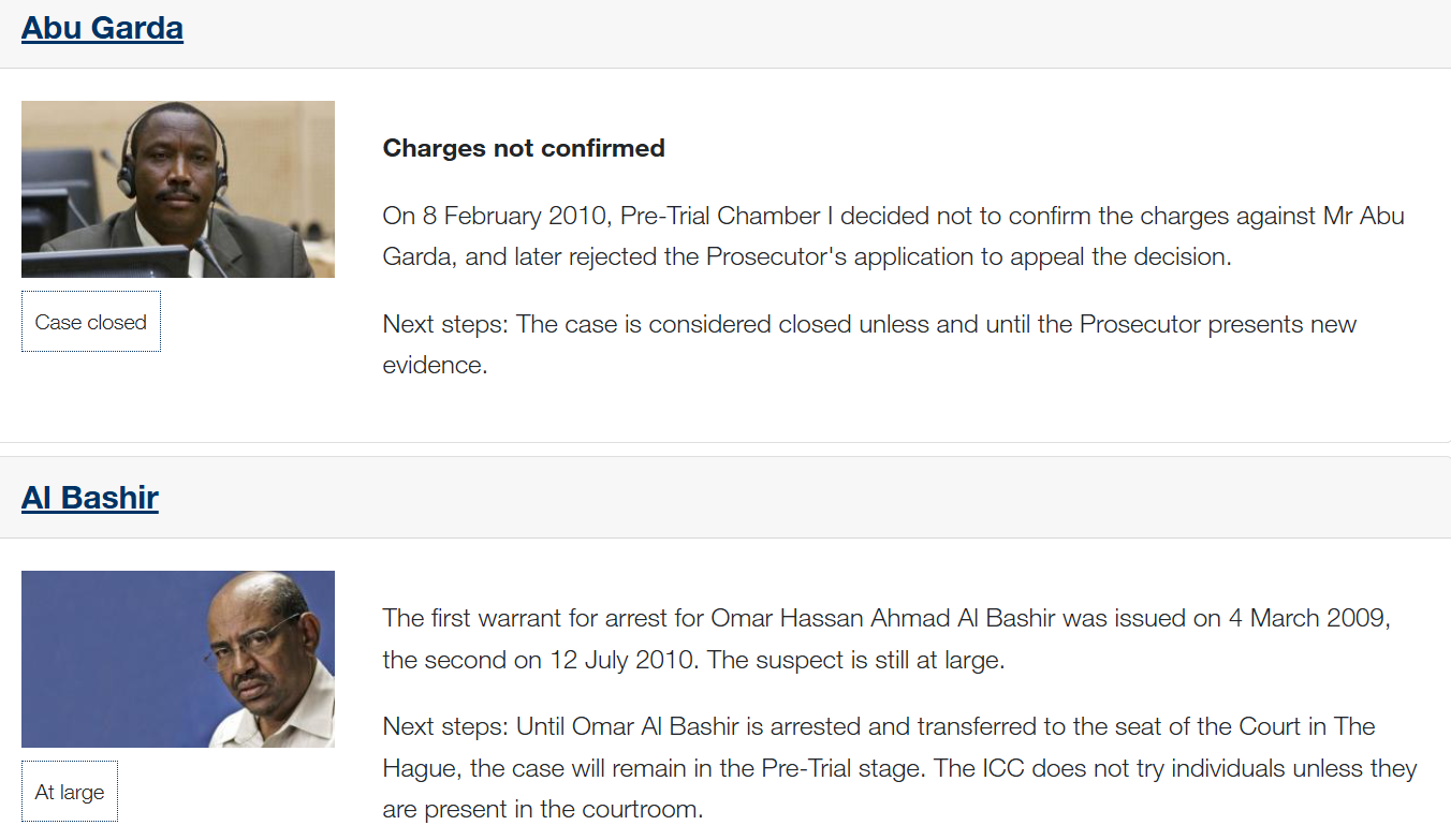 A büntetőbíróság jellemzően háborús bűnök és emberiesség elleni bűncselekmények elkövetése miatt ad ki elfogatóparancsot, eddig mindössze egyszer fordult elő, hogy valakit népirtás bűntettével vádoltak: Omar el-Basírt, Szudán korábbi elnökét. Ő jelenleg szintén szabadlábon van.