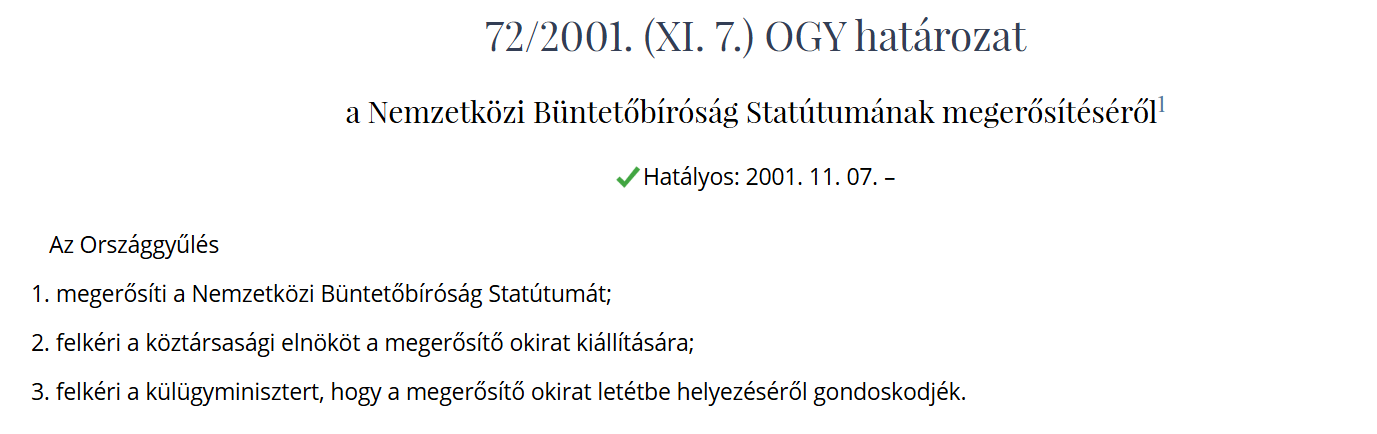 – mondta a Lakmusznak Hoffmann Tamás nemzetközi jogász, a Budapesti Corvinus Egyetem docense. Majd megjegyezte: Magyarország 2001 novemberében ratifikálta az ICC statútumát, de azóta valóban nem hirdette ki. (A kihirdetés azt jelentené, hogy a magyar jogalkotó külön magyar jogszabályt alkot rá, ez azonban nem történt meg, a ratifikáció csupán egy országgyűlési határozatot jelentett.)